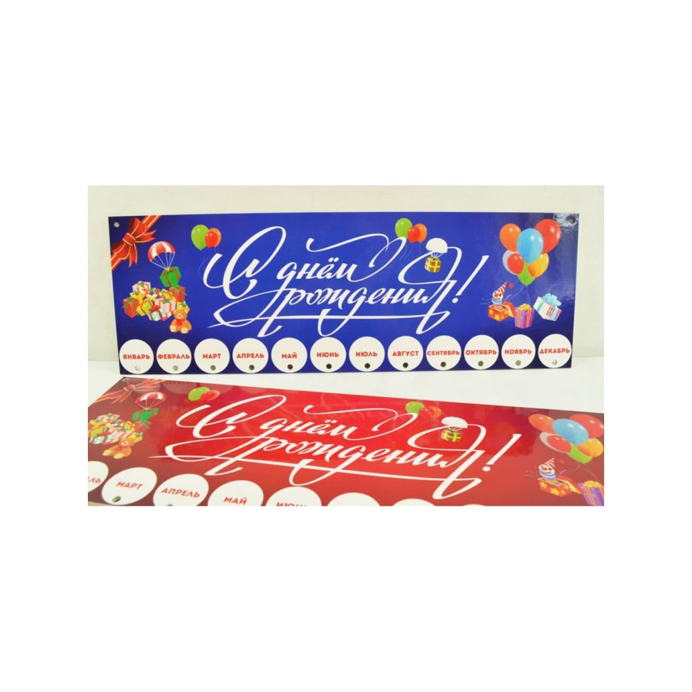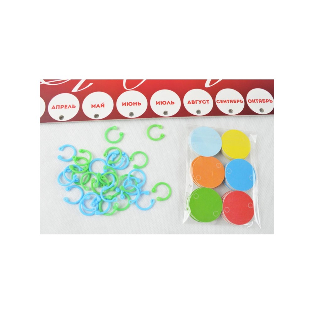 Размер календаря 445х150 мм (44,5х15 см). Основная часть календаря это 1,5-2 мм картон с наклеенным (кашированным) лайнером на картона с глянцевой ламинацией. Оборот также с наклеенным белым картоном. Календарь не гнется, не изгибается ввиду свой толщины. Кружки (подвесы) для надписей дат дней рождений и имен имеют диаметр 34 мм. Изготовлены из толстого картона, напечатаны с одной стороны (6 цветов: голубой, синий, красный, оранжевый, зеленый, желтый). Писать даты на кружочках необходимо маркером или ручкой. Соединительные кольца цветные (два цвета в комплекте) пластиковые разъемные и довольно легко зажимаются. Внешний диаметр кольца 15 мм, внутренний около 12 мм.
