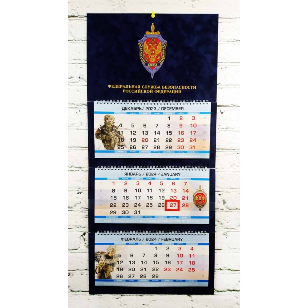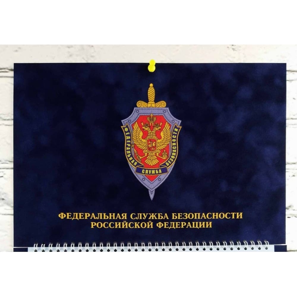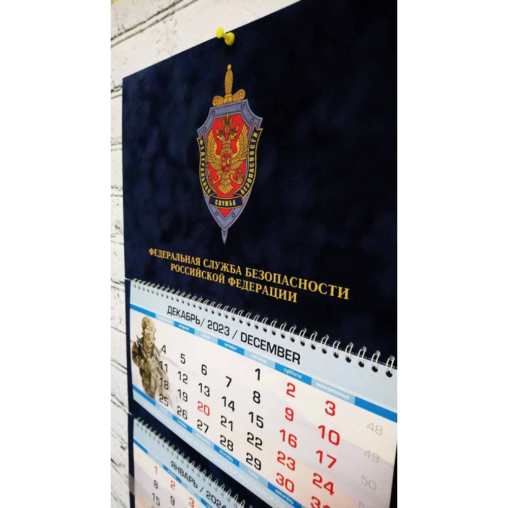 Настенный квартальный календарь ФСБ Российской Федерации бархатный темно-синий со логотипом ФСБ. Трехблочный календарь с индивидуальными блоками на 2024 год. Постер и подложки на плотной бумаге бархатной темно-синего цвета. На верхнем постере прямая цветная печать.
