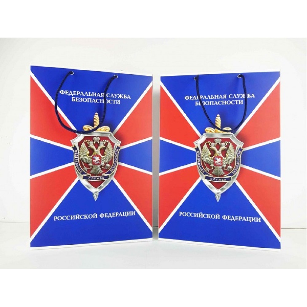 Подарочный пакет ФСБ (Федеральной службы безопасности). Эксклюзивный пакет для оригинального подарка. В пакет с легкостью поместится подарок или две бутылки с напитком. Изготовлен из мелованной бумаги с матовой ламинацией и имеет укрепленные ручки и дно. Данная упаковка для подарка будет на сто процентов индивидуальной и незабываемой!